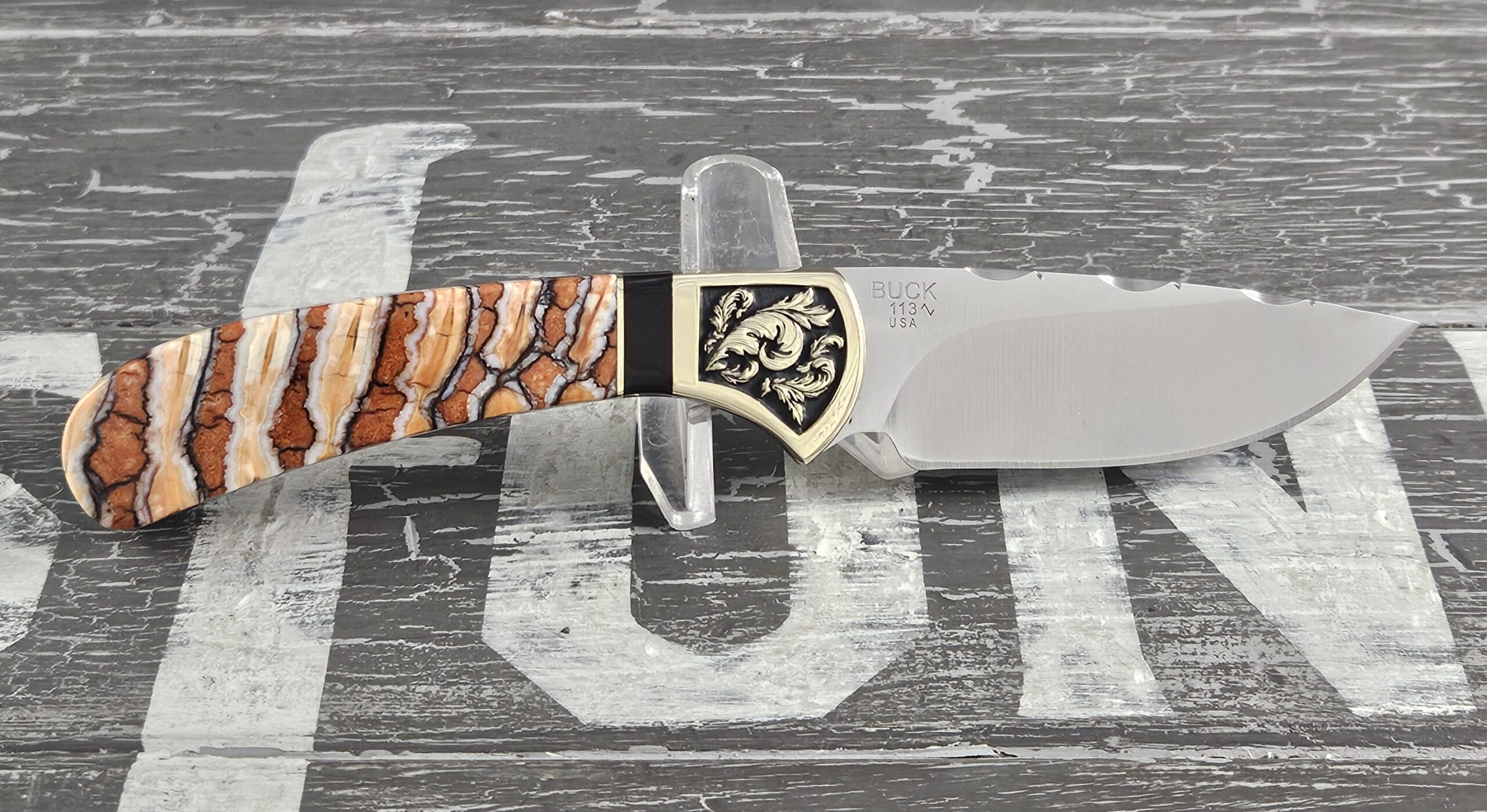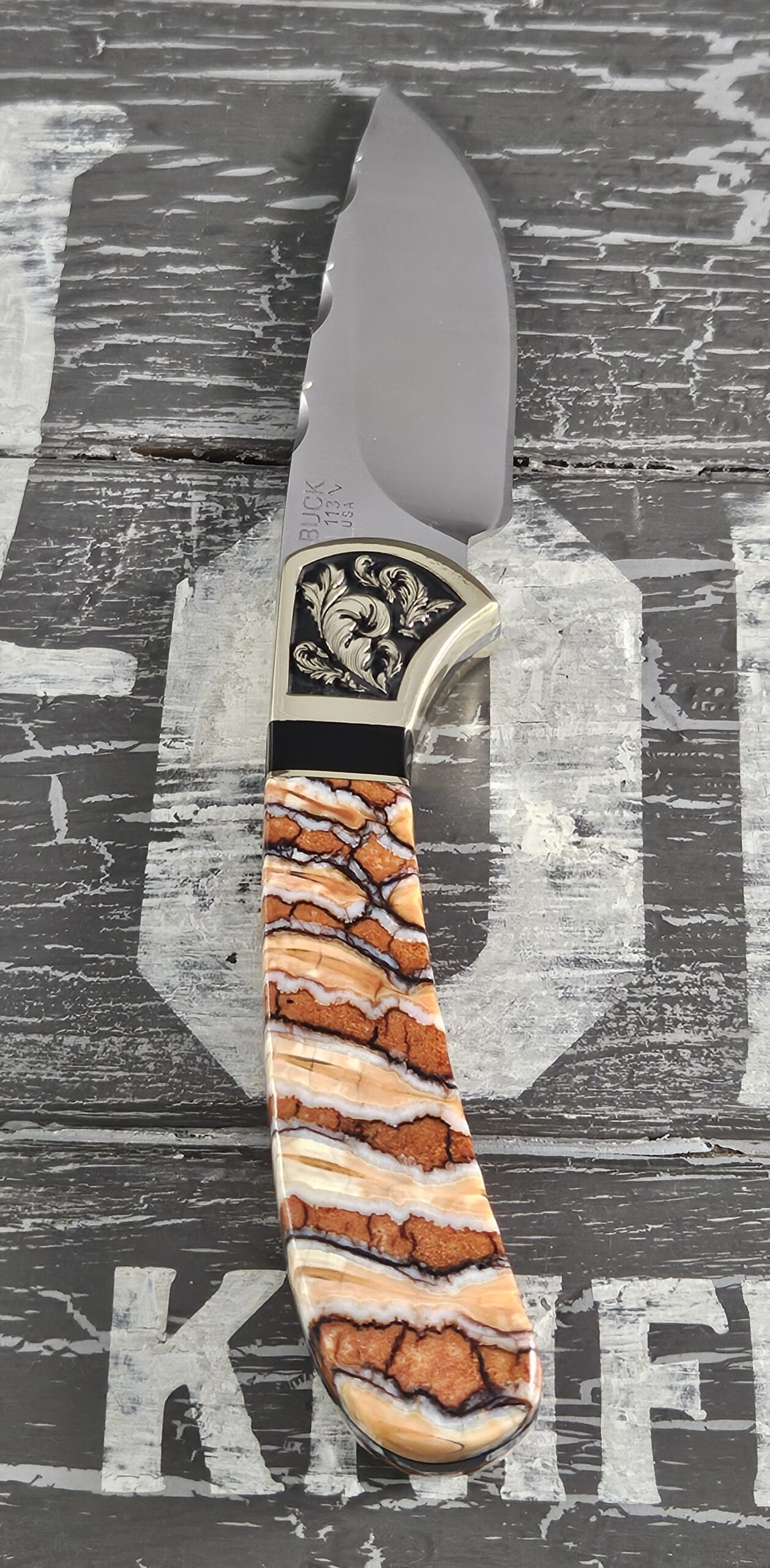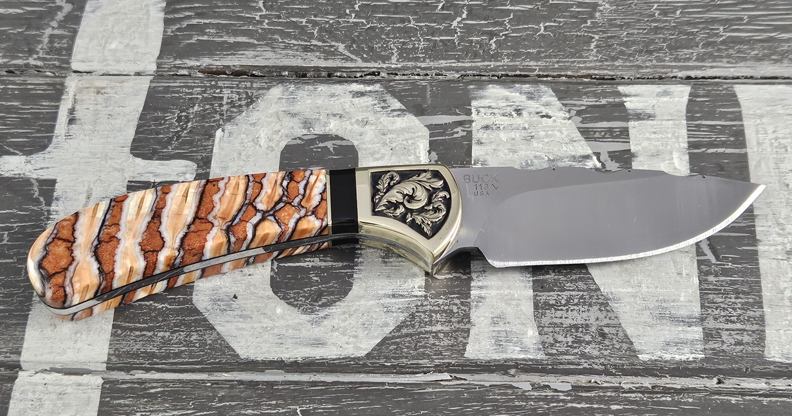This is a customized Buck Knife 113 Skinner. This 113 is a part of our Woolly Mammoth Series. The handles are Woolly Mammoth tooth with black liners. The brass bolsters have a scroll work engraved into both sides. The trim is onyx and brass. The knife comes with its original box and sheath.