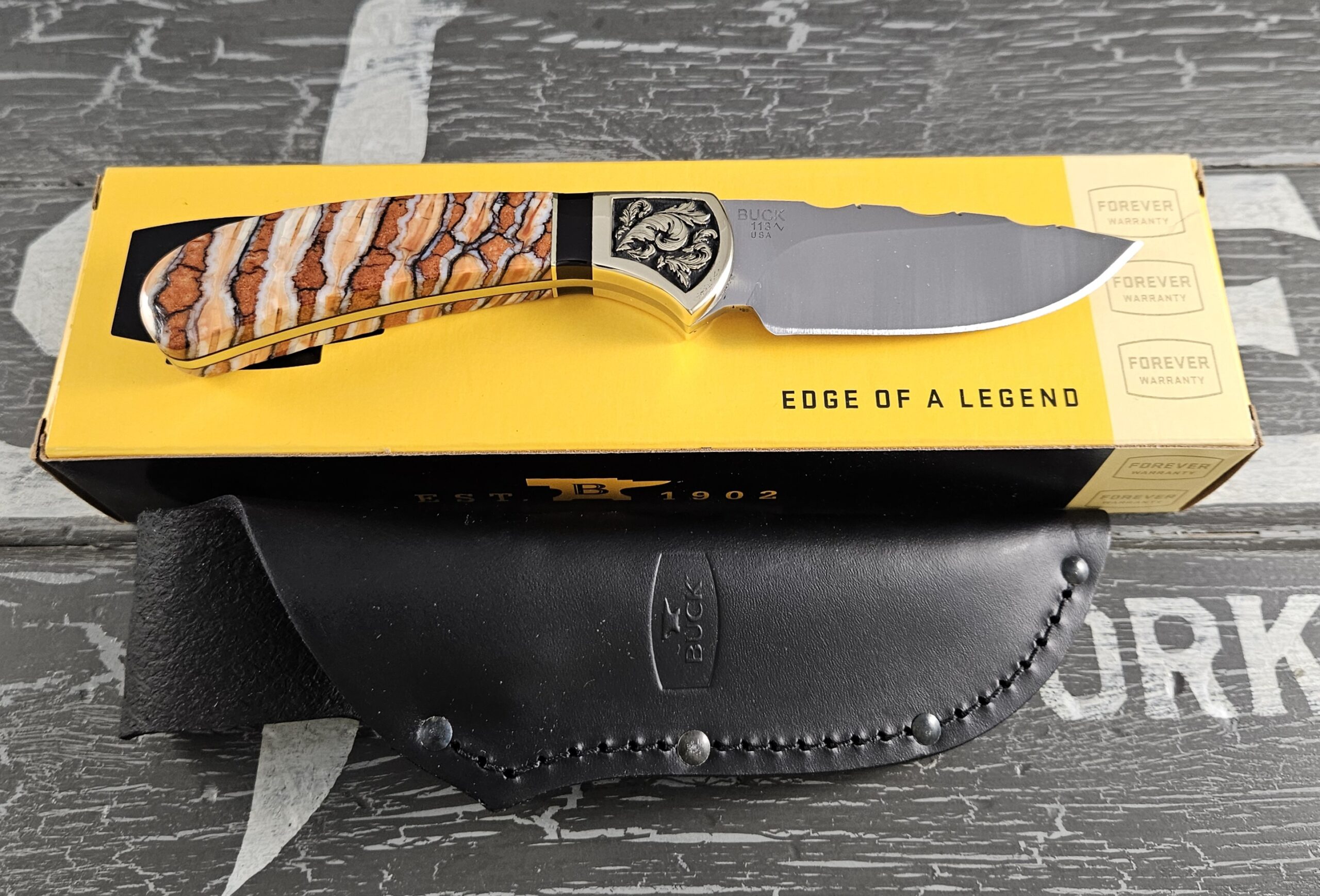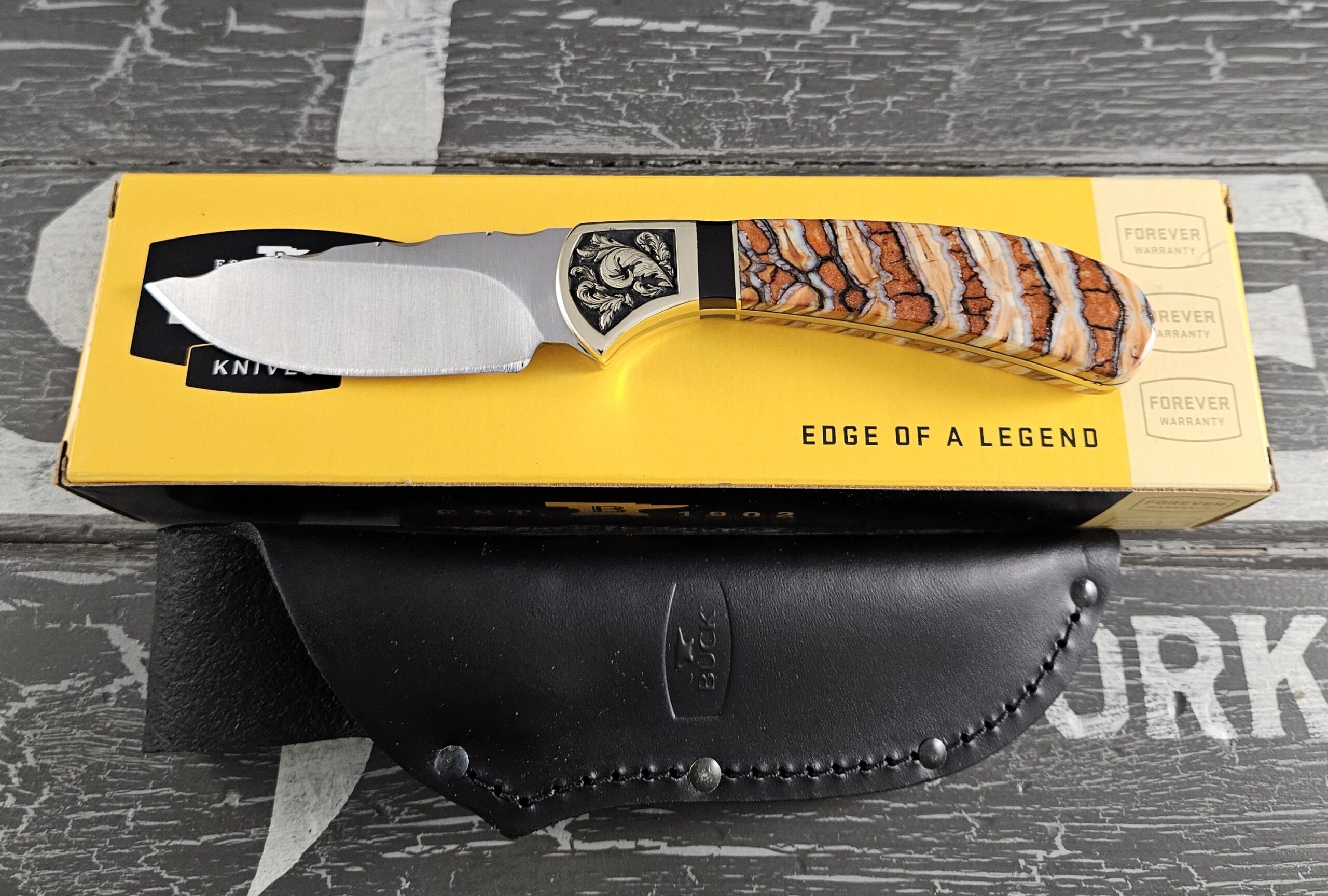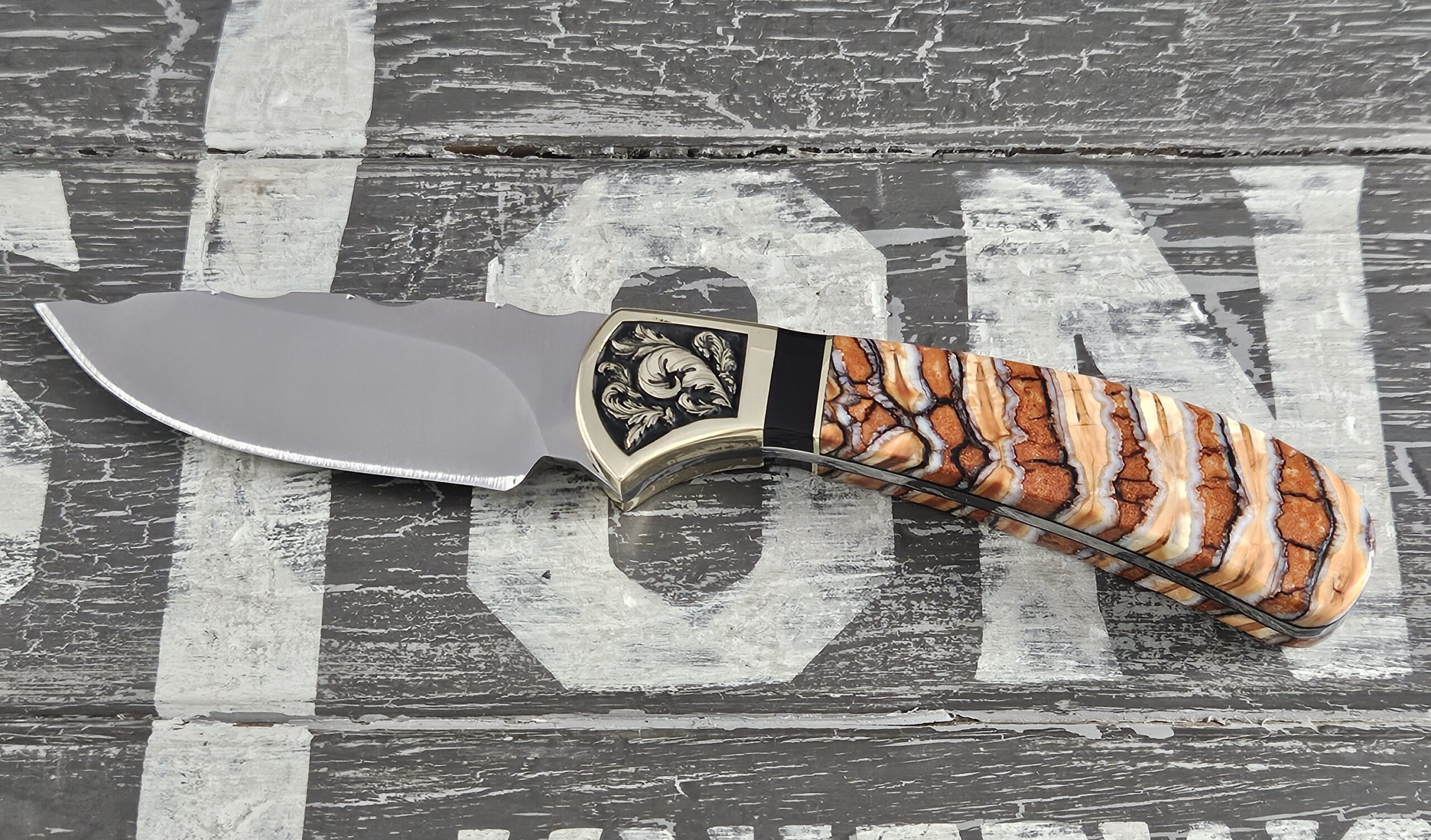 This is a customized Buck Knife 113 Skinner. This 113 is a part of our Woolly Mammoth Series. The handles are Woolly Mammoth tooth with black liners. The brass bolsters have a scroll work engraved into both sides. The trim is onyx and brass. The knife comes with its original box and sheath.