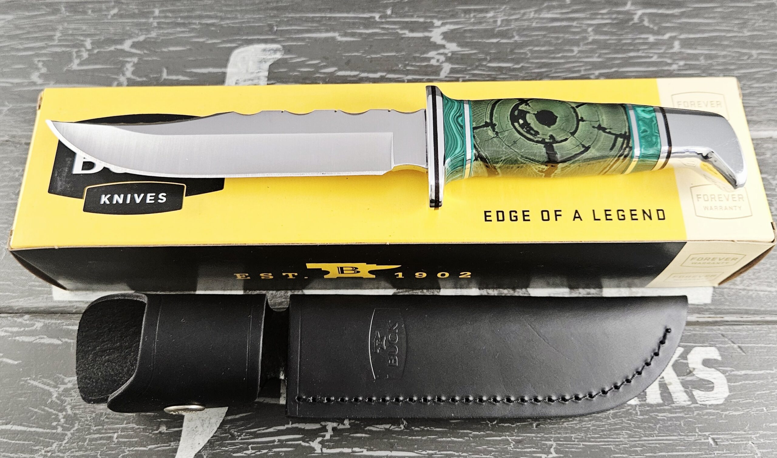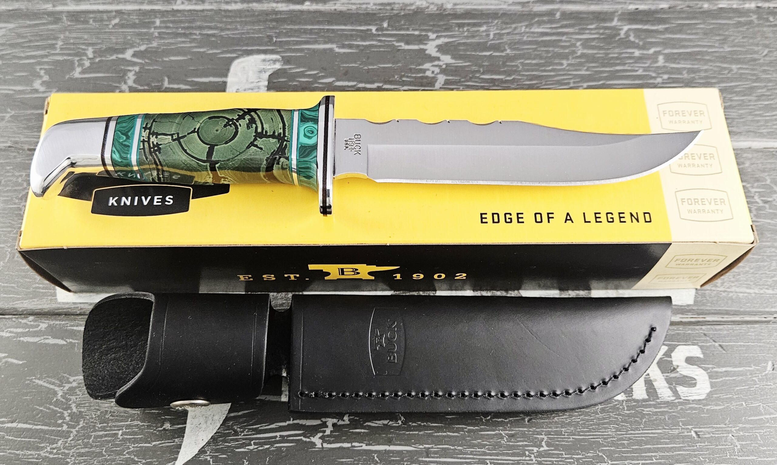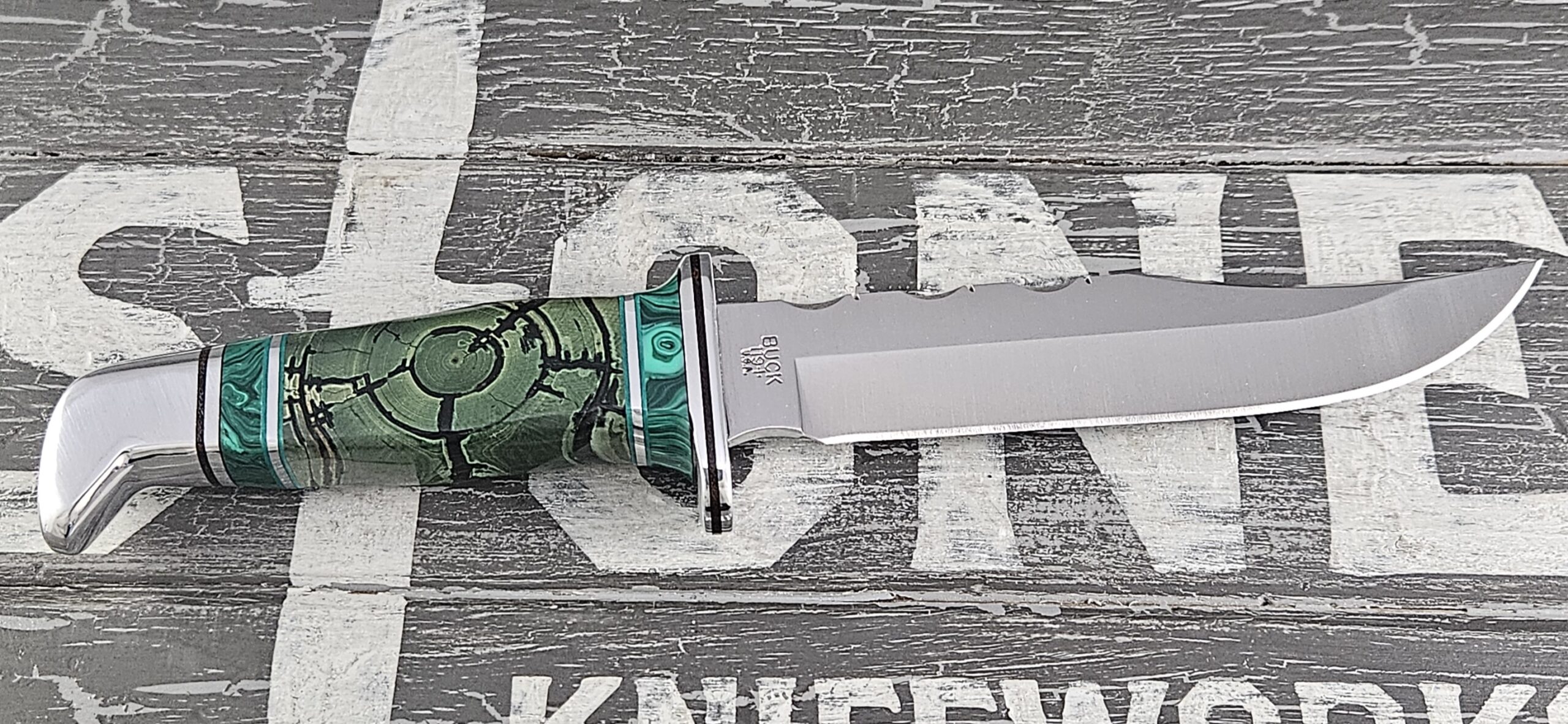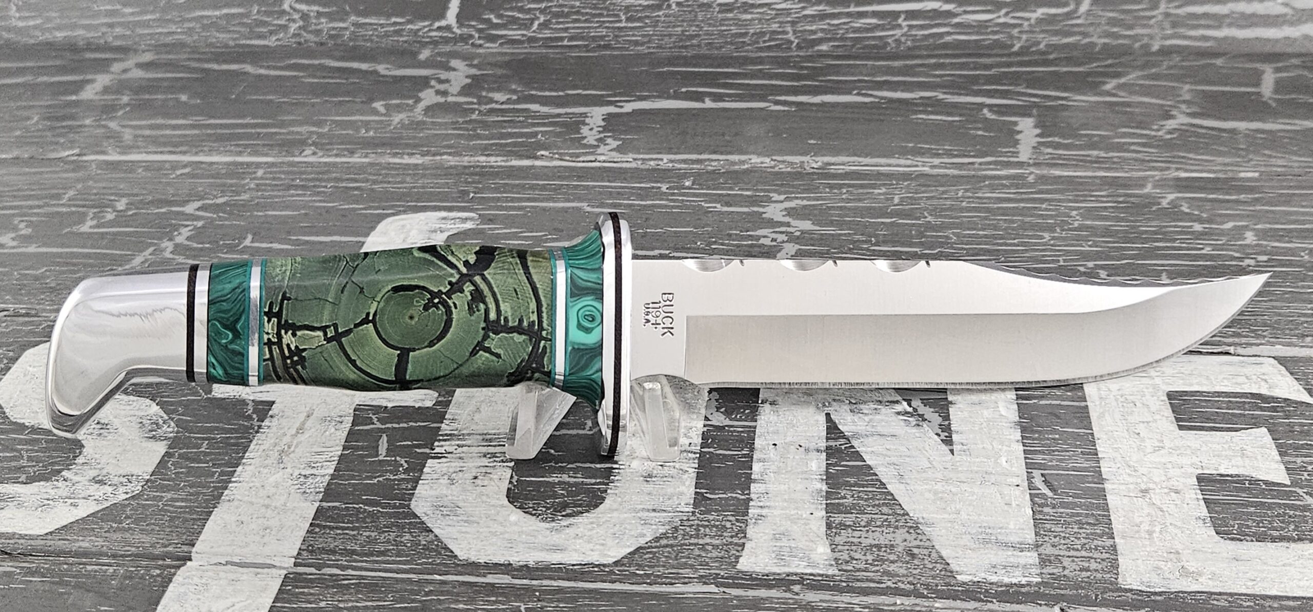 This is a customized Buck Knife 119 Special. This 119 is a part of our Woolly Mammoth Series. The handle is a solid block crosscut Woolly Mammoth ivory tusk. The spacers are malachite and nickel silver. The blade does have file work as well. The knife comes with a new sheath, box, and COA. This knife was purchased new and customized.