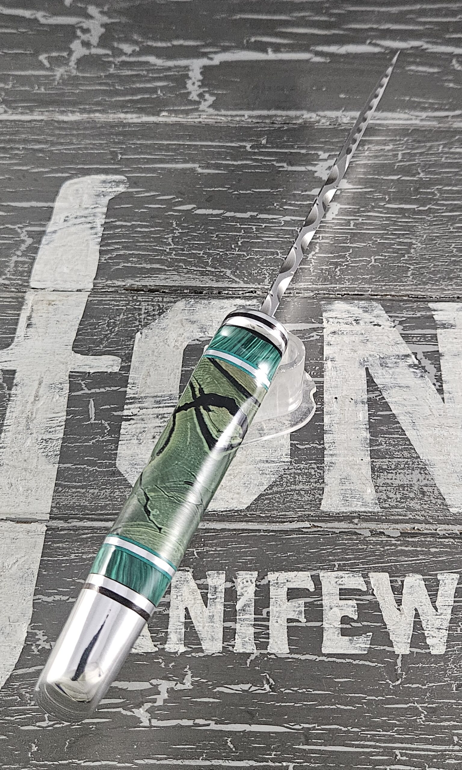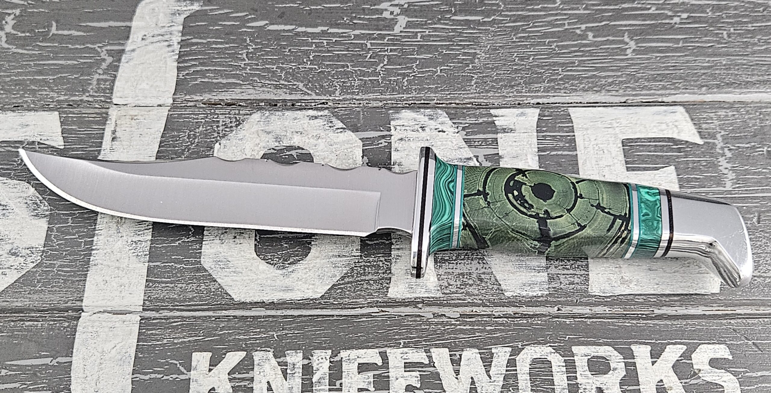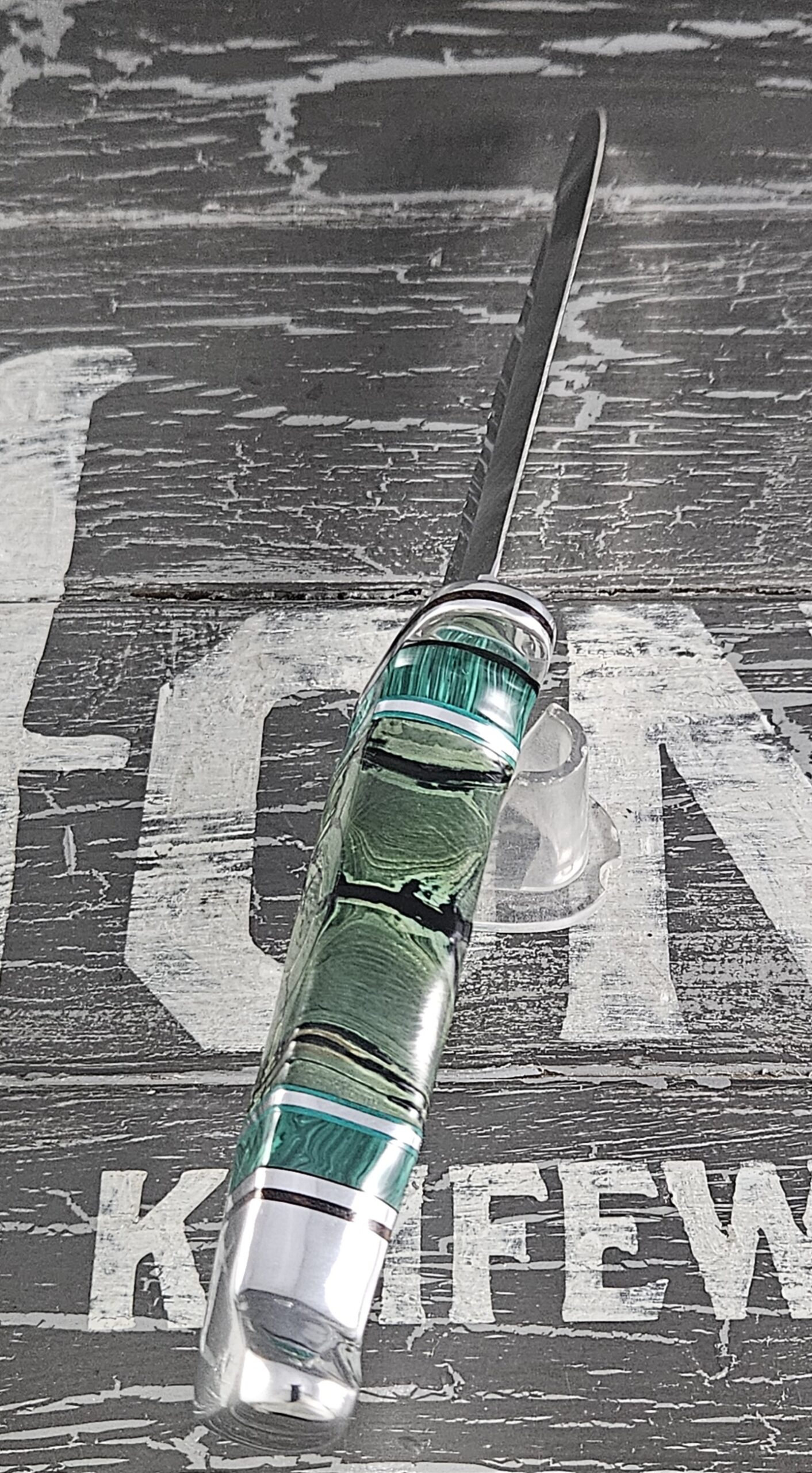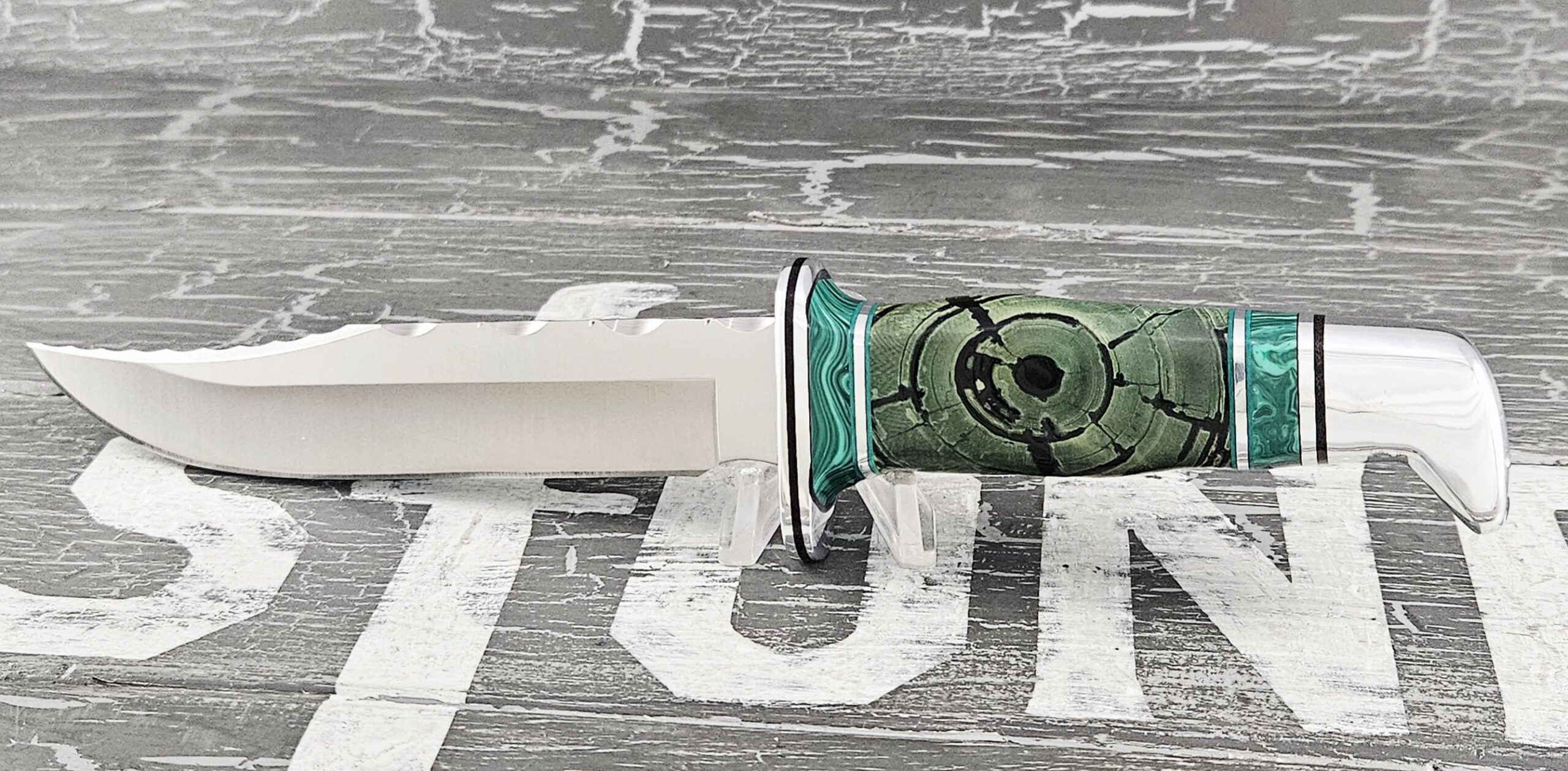 This is a customized Buck Knife 119 Special. This 119 is a part of our Woolly Mammoth Series. The handle is a solid block crosscut Woolly Mammoth ivory tusk. The spacers are malachite and nickel silver. The blade does have file work as well. The knife comes with a new sheath, box, and COA. This knife was purchased new and customized.